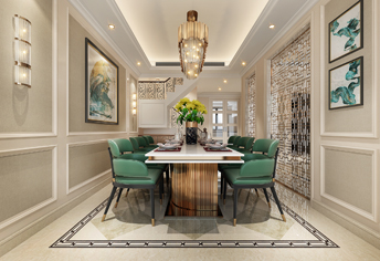 房屋格局動靜分離,房屋結構適合三口之家。門廳的穹頂寓意步步高升,做事圓滑。墻面鏡面,即使用又增添了如何的空間感。客餐廳地面全部玉石通鋪,頂面鑲金嵌銀,家具及定制品以柚木無主。
