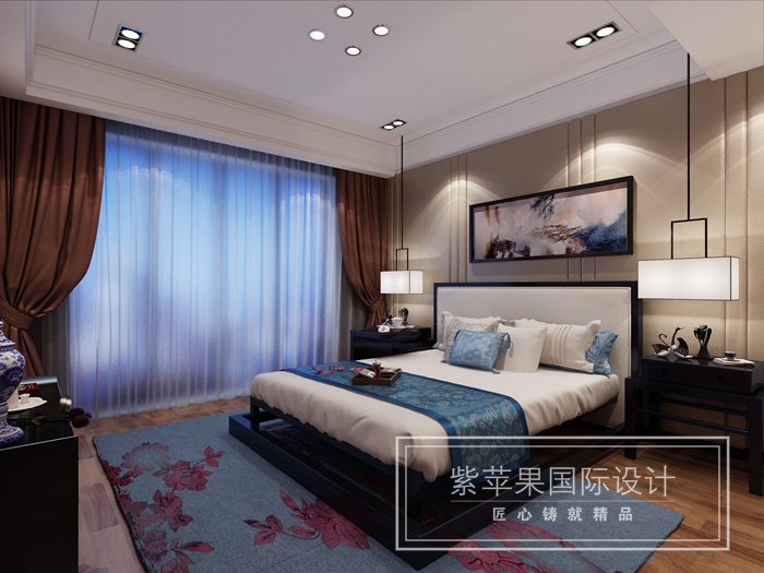 餐廳區(qū)域獨立開辟出一塊羅漢床位置,融合了圍棋對弈、擺件展示、喝茶區(qū)的多功能空間,也使得整個公共區(qū)域更添一抹文化的氛圍和質(zhì)感,臥室里大面積藍色的運用使整個空間更加靜謐安然,有助于忙碌一天的主人更好的入眠,此案活潑大膽的用色體現(xiàn)了設(shè)計師對于色彩的把握,讓我們體驗到了不一樣的新中式。