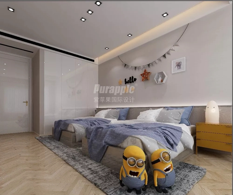 兒童臥室,選擇了與主臥相似的極簡白色吊頂,灰色的床頭柜造型,也是質(zhì)感十足,極簡童趣的床頭掛飾和可愛的床頭燈瞬間提升空間的靈動性。