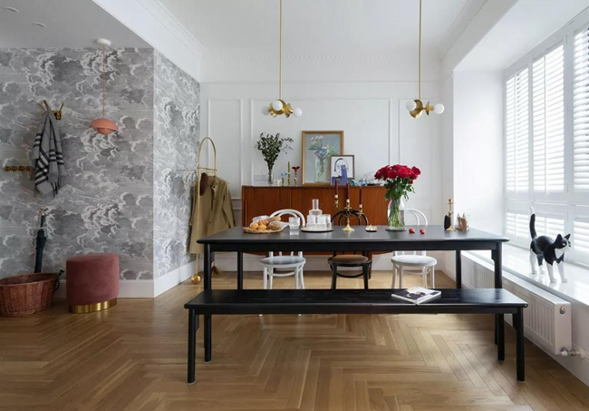 大餐廳放置了2米2的大長桌,之后的不停歇的家庭聚會,歡聲笑語也都在這里。除了宴會,平常大長桌也是一家人一起做手工的地方。陽臺的百葉窗,隨時會有一束斜陽照在俏皮的貓咪身上。
