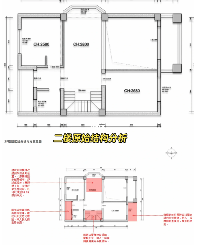 2F:現(xiàn)澆原來(lái)調(diào)控的位置做成一個(gè)起居室,南面是一個(gè)主臥大套房,北面是父母的套房