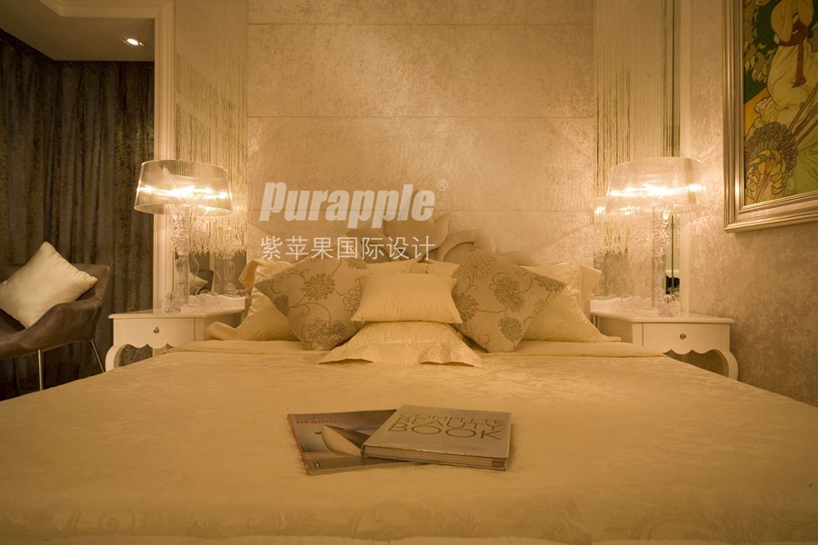 2、輕柔浪漫色調(diào):中心色為柔和的粉紅色。地毯、燈罩、窗簾用紅加白色調(diào),家具白色,房間局部點(diǎn)綴淡藍(lán),有浪漫溫柔的氣氛。