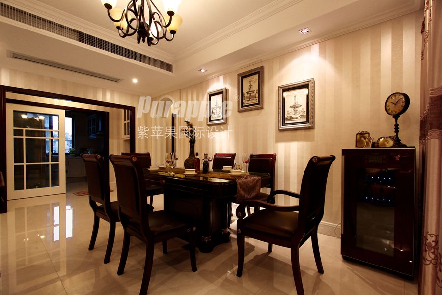 實(shí)木餐桌椅難以突破造型方面的禁錮,怎么看都是老舊又呆板。為餐廳的空白墻選一幅大尺寸的藝術(shù)畫,畫風(fēng)可以抽象簡約,如果你喜歡色彩,熱情奔放的圖案也是不錯(cuò)的選擇。別墅裝修設(shè)計(jì)中有了藝術(shù)畫的襯托,整體品味一下子就被提升了,基礎(chǔ)款家具看起來也更大牌了。