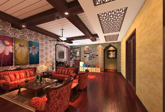 同時(shí)還要在節(jié)制筆觸中找到讓人感覺(jué)尊寵的地方,諸如在中式別墅庭院中建造一個(gè)廣亮大門,在庭院中掇山理水,在室內(nèi)雕梁畫(huà)棟,運(yùn)用井字天花,金磚墁地。