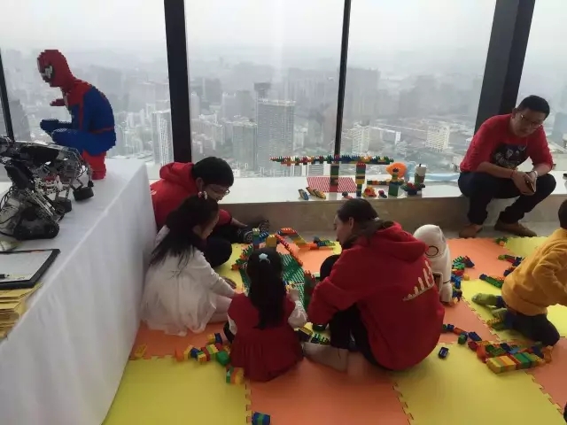 兒童娛樂區(qū),小業(yè)主們聚在一起跟小機(jī)器人還有樂高玩具玩。瞧!他們與工作人員一起玩的多開心~