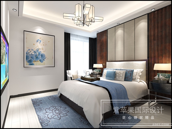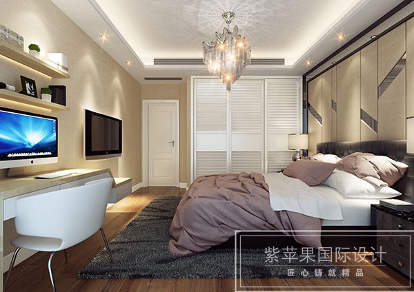 臥室的功能主要是睡眠休息,屬私人空間,不向客人開放,所以臥室裝修不必有過多的造型,通常也不需吊頂,墻壁的處理越簡潔越好,通常刷乳膠漆即可,床頭上的墻壁可適當做點造型和點綴。臥室的壁飾不宜過多,還應與墻壁材料和家具搭配得當。臥室的風格與情調(diào)主要不是由墻、地、頂?shù)扔惭b修來決定的,而是由窗簾、床罩、衣櫥等軟裝飾決定的,它們面積很大,它們的圖案、色彩往往主宰了臥室的格調(diào),成為臥室的主旋律。下面我們來欣賞下【無錫紫蘋果裝飾】臥室裝修效果圖