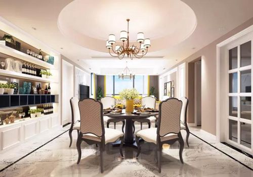 最美的風(fēng)景不過如此,古典與浪漫的結(jié)合,圓形吊頂與圓形餐桌上下呼應(yīng),古典韻味的墻布和美式浪漫氣息融為一體,打造嫻靜優(yōu)雅的用餐環(huán)境