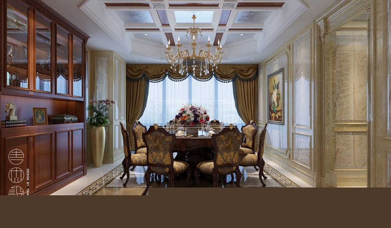 客餐廳空間色彩層次豐富,呈現(xiàn)出歐式風(fēng)格的華貴和浪漫。在布局上采用對(duì)稱,配合地面豐富的歐式拼花,每個(gè)元素都蘊(yùn)藏著卓然的審美品位,演繹出一曲華貴典雅美妙樂章。