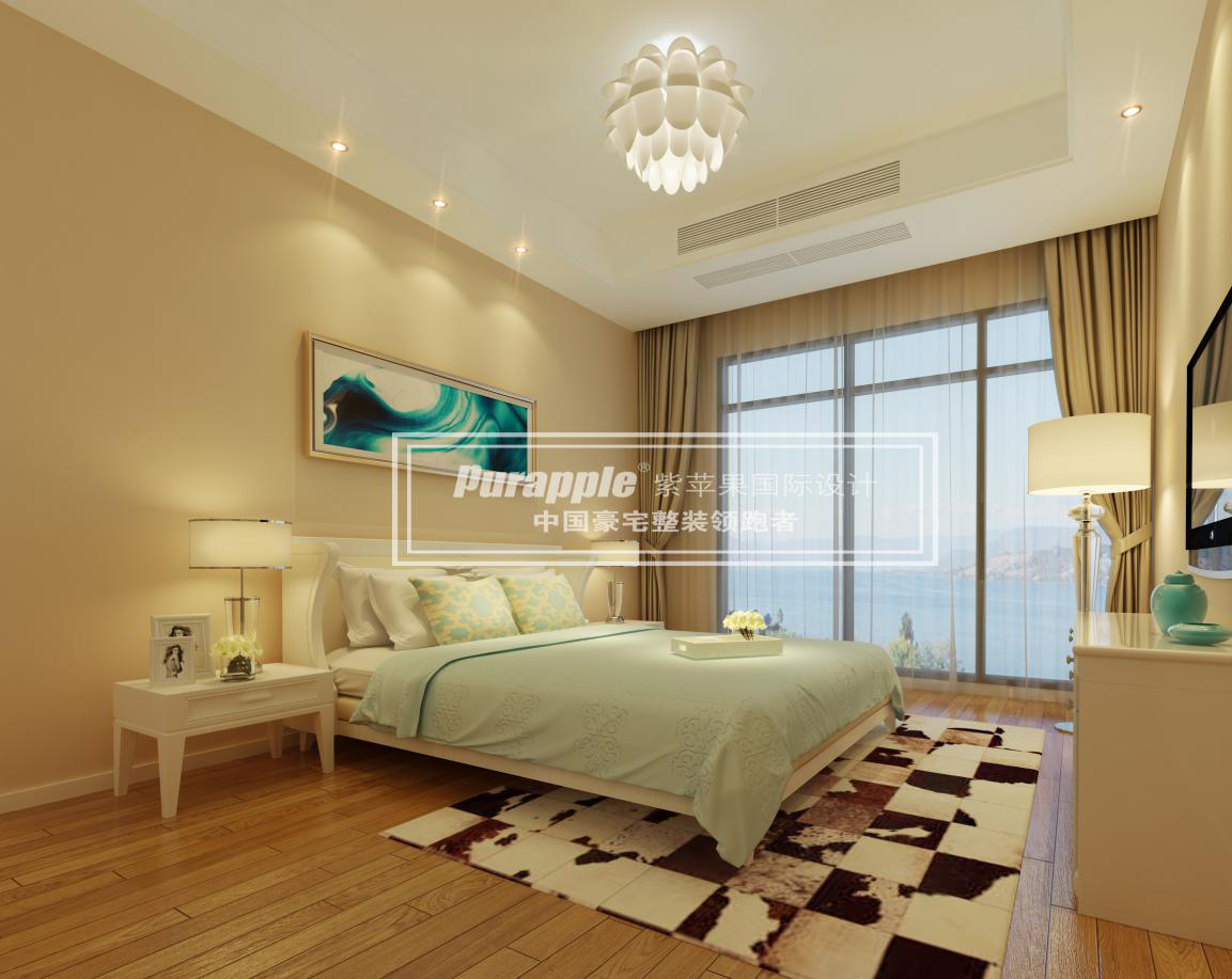 臥室內(nèi)色彩宜淡雅,色彩的明度宜低于客廳,同時可以用床蓋、窗簾、靠墊等軟裝飾的色彩與質(zhì)地營造室內(nèi)氣氛。
