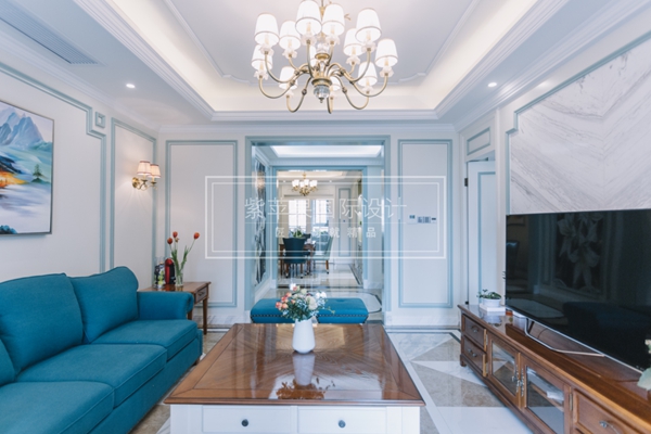 海藍(lán)色圖案壁紙,同色圖案沙發(fā),暖色調(diào)的地板及窗簾,航海風(fēng)格一覽無余。沙發(fā)與掛畫的存在更是將這種風(fēng)格表現(xiàn)的淋漓盡致。行走在被藍(lán)色包裹的空間,猶如暢游在無垠的大海中,無拘無束的生活姿態(tài)將對率性自由的生活渴望表達(dá)的極致細(xì)膩與充分。